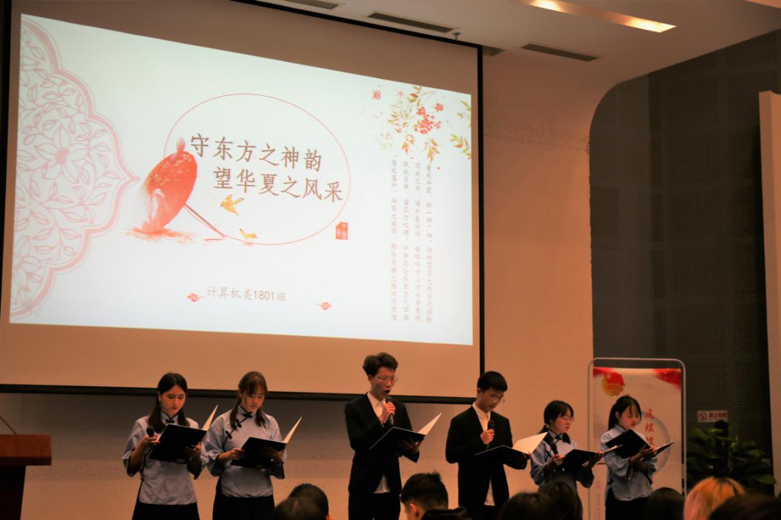 第一篇章“文化传承”,计算机类1802团支部以《传盛世经典,诵华夏文明》开篇,计算机类1801团支部进行题为《守东方之神韵,望华夏之风采》的朗诵,传盛世经典,颂华夏文明,展现了计算机学子对传统文化的热爱与对文化自信的坚守。
