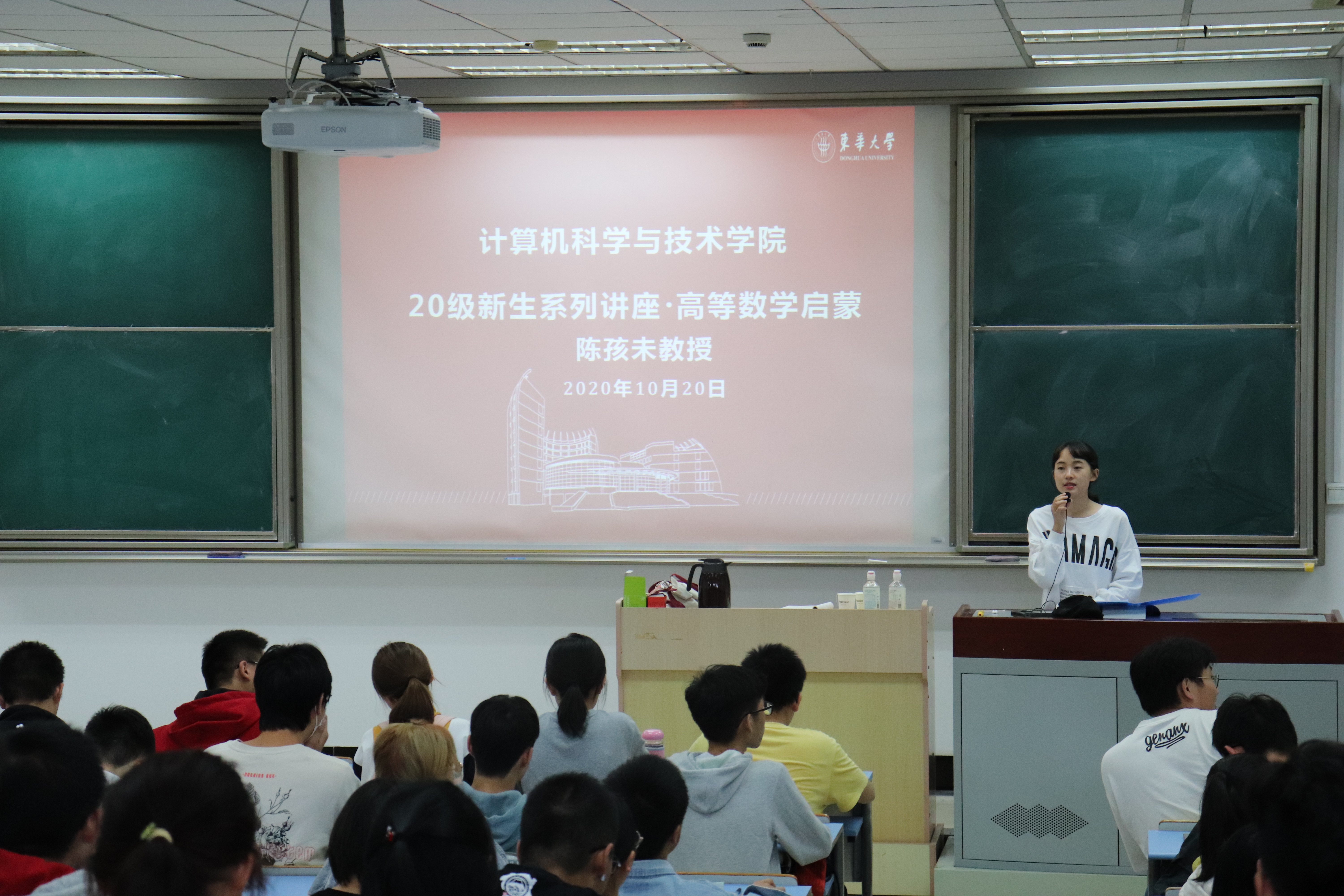 2020年10月20日下午15点30分,计算机科学与技术学院于松江校区第二教学楼2229室开展了20级本科新生系列讲座⋅第1讲:高等数学启蒙。参与此次讲座的有东华大学关工委讲师团成员陈孩未老师、计算机科学与技术学院20级本科新生辅导员姜霖霖、张莉萍,计算机学院20级全体本科新生参与了讲座。