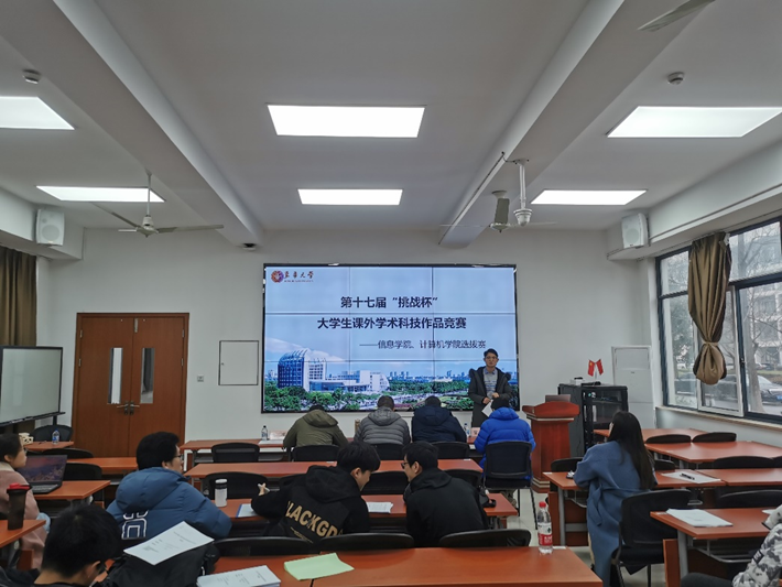 2021年3月11日13:00,在1号学院楼140报告厅计算机学院、信息学院联合组织开展第十七届“挑战杯”全国大学生课外学术科技作品竞赛院内选拔赛,推荐优秀作品参加东华大学选拔赛,本次选拔赛邀请到计算机学院副院长石秀金、信息学院副院长张光林、校团委副书记邵楠、专业教师赵鸣博、徐波担任评审,由计算机学院团委书记张政主持。