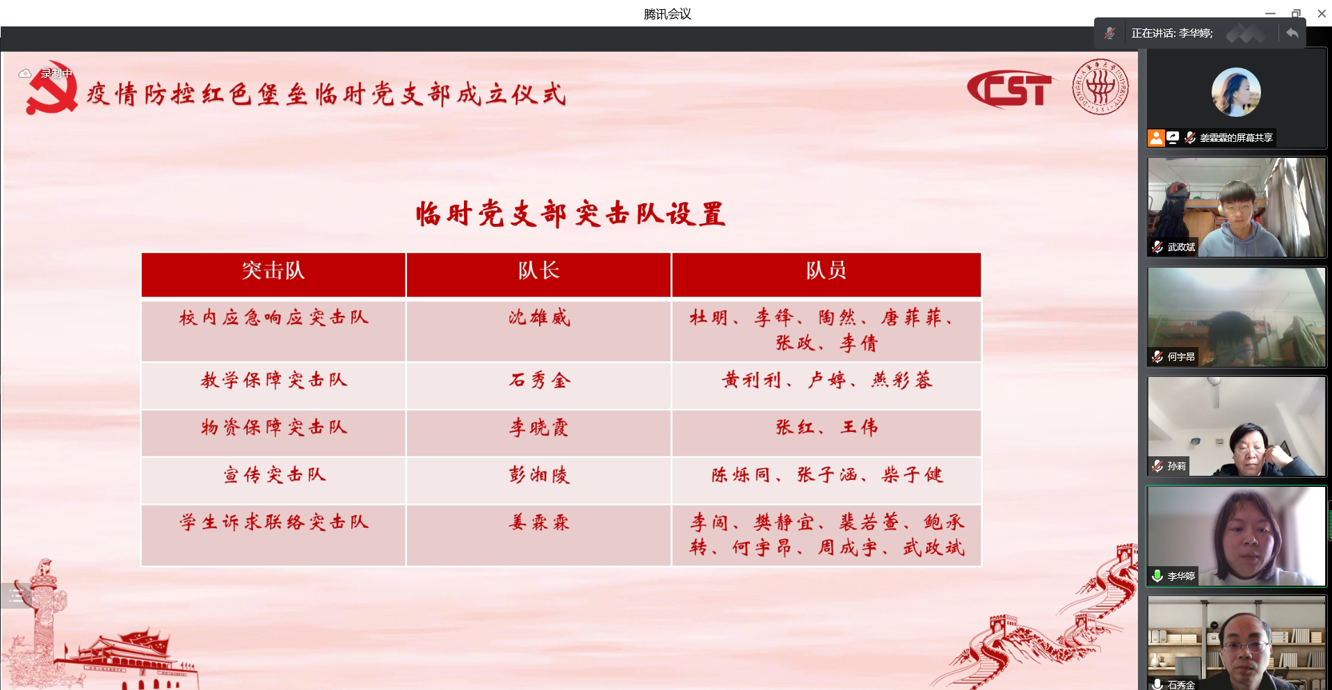 疫情防控红色堡垒临时党支部成立仪式上,孙莉同志宣读了《关于成立计算机科学与技术学院疫情防控红色堡垒临时党支部的决定》并提出当前疫情防控形势严峻,我们要积极做好应对后续各项工作的准备,我们要统一思想,坚定信心,我们还要勇于担当,行动迅速。临时党支部不仅承担起疫情防控期间各项保障工作的推进,更要关心教师学生,承担起了解教师学生诉求,营造和谐向上氛围的责任。