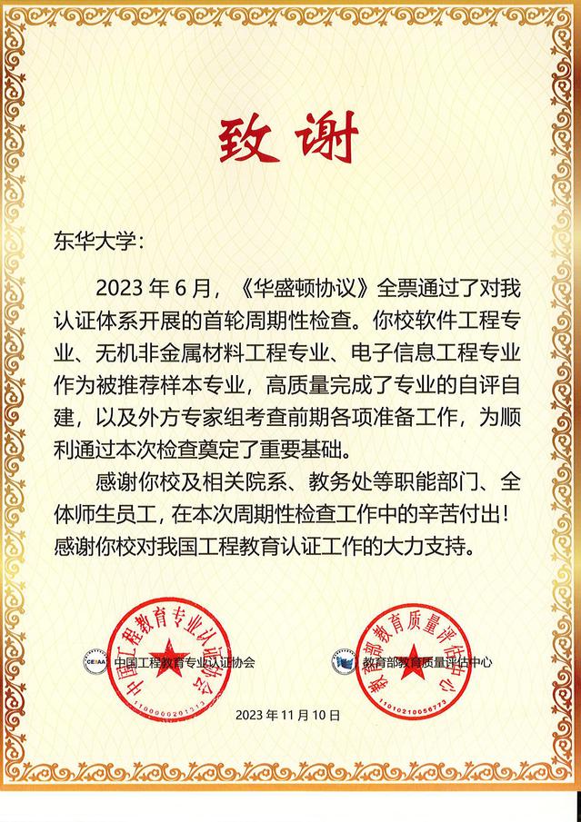 近日,学校收到了中国工程教育专业认证协会和教育部教育质量评估中心联合发来的致谢信,对星空体育中国官方网站软件工程等三个专业作为样本专业高质量完成专业自评自建和在迎接华协检查所做的扎实准备工作表示感谢。