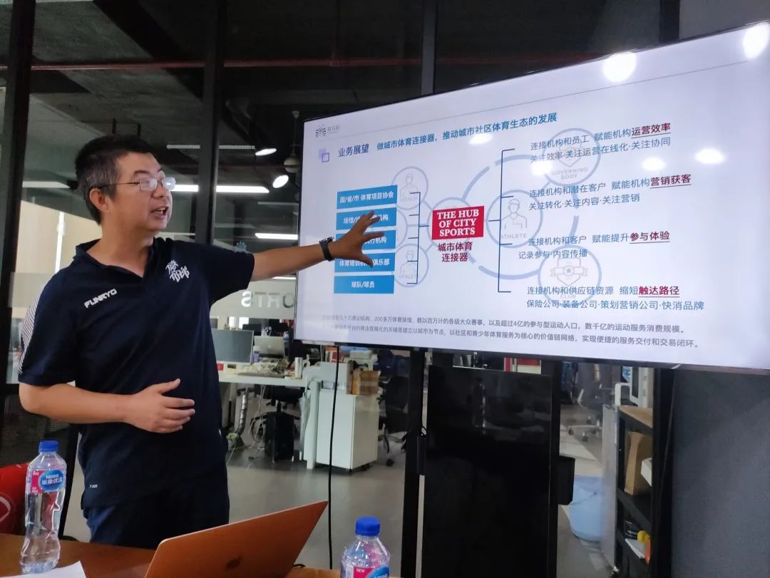 蔡昭华校友首先为实践团成员简单介绍了他的公司。“在上海业余踢足球的,大多应该听说过或者正在用斑马邦。”他很有自信地对实践团成员说,“实践团成员一直在做的事情,就是把体育和科技结合起来。”他说,斑马邦成立之初,主要服务于业余球友。想要和同城的球友约一场球赛,或者想要加入当地的一个业余球队,通过斑马邦可以很轻松的实现。随着公司的发展,斑马邦逐步加入了赛事管理、赛事直播、运动险投保等功能。他们的愿景是成为城市体育连接器,将不同的主体连接起来,推动城市社区体育生态的发展。