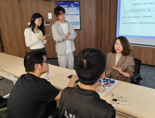 随后,同学们参观了办公区域,工作人员以“游戏开发者的一天”为主题,向同学们介绍了游戏公司大致的工作内容。