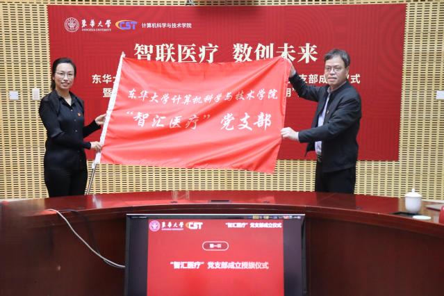 东华大学党委组织员赵北琳宣读关于成立“智汇医疗”党支部的决定,并为“智汇医疗”党支部支部书记陈德华授旗。随后,党支部书记陈德华讲授题为《党建引领智慧医疗发展的实践探索》的主题党课,他从“智汇医疗”党支部成立背景出发,阐述了党支部在党建引领智慧医疗发展中的已有成果和未来支部建设的规划和设计。