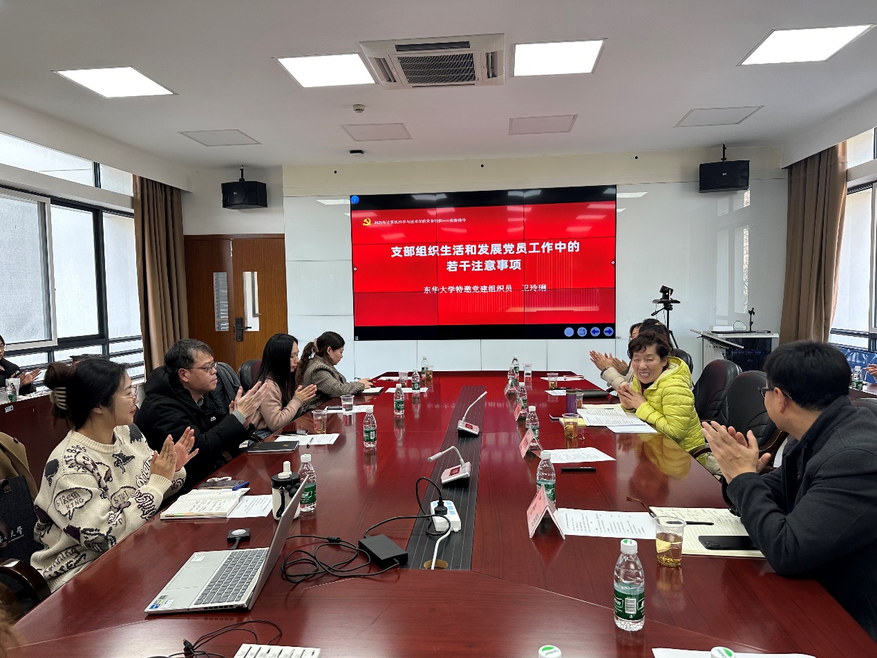 在政策培训环节,第一实验室基地学生党支部书记董文清和第一校外实习基地学生党支部书记王欣钰分别对《中国共产党支部工作条例(试行)》和《中国共产党党员教育管理工作条例》进行了深入解读。两位主讲人详细讲解了条例的核心内容和实施要点,帮助与会的支部基层党务工作者深入理解和掌握开展支部工作的两项基本遵循。在实务指导环节,东华大学特邀党建组织员卫玲琍老师围绕支部组织生活和发展党员工作中的注意事项,结合具体工作案例,进行了细致的讲解和指导。在近期工作交流环节,与会师生党支部支委会成员就支部工作中遇到的困难、困惑及年度工作打算进行了交流,互学互鉴,共同提高。