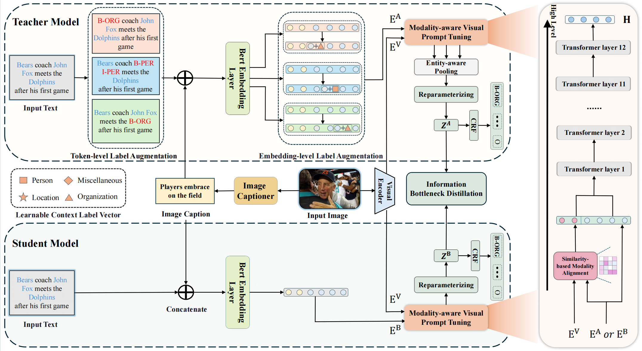 针对这一挑战,本工作提出了全新的LIBD(Label-Enhanced Information Bottleneck Distillation)框架。相较于现有方法主要依赖外部知识库或简单数据增强的做法,LIBD 首次将“标签增强”与“信息瓶颈蒸馏”相结合:其中教师模型通过双层标签增强(DLA)避免对已知实体的过拟合,学生模型则借助信息瓶颈蒸馏(IBD)精准吸收教师模型的关键信息同时抑制噪声。大量实验显示,LIBD 在Twitter2015 与Twitter2017 两大公开数据集上整体F1 值优于当前SOTA,并在未见实体识别场景中实现显著性能提升。