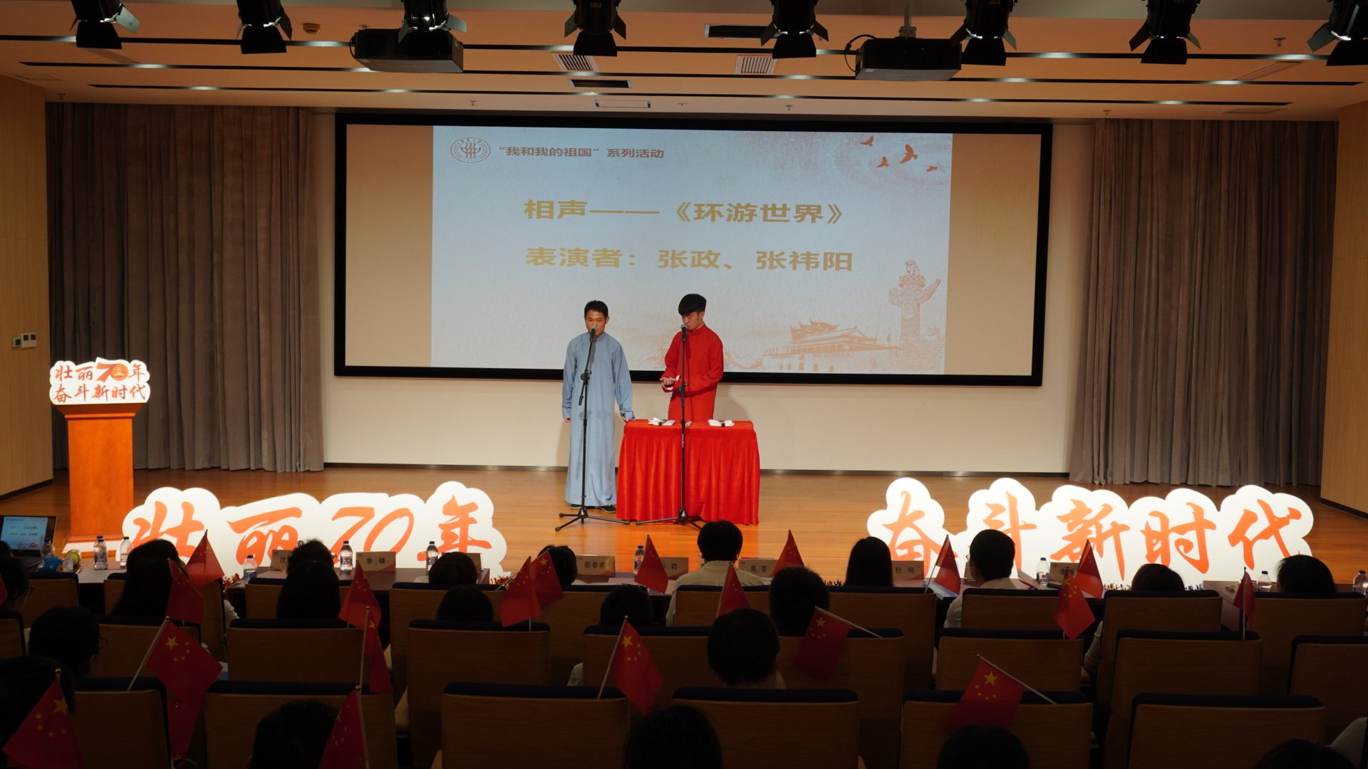 本次活动紧扣“我和我的祖国”专题教育,围绕“初心颂——不忘初心,与国同梦”,“爱国情——峥嵘岁月,同心筑梦”,“奋斗者——砥砺前行,奋斗圆梦”三个篇章,以初心追梦者、爱国筑梦者、奋斗圆梦者的形式表现计算机学院的党员师生对于祖国70岁的庆生之情。其中,软件系教工支部伴随激昂的旋律,以祖国70年的奋斗史为背景,讲述了东华人的爱国情。平行专业学生党支部以创新情景剧的方式,结合朗诵,歌曲,通过祖孙三代人展示祖国70年的变化。由学院专职辅导员张政老师与相声社社长张祎阳同学带来的相声《环游世界》,用风趣幽默的语言展示了环游世界还是祖国最好的朴素情感,将全场气氛推向高潮,在欢声笑语中共同为祖国庆生。