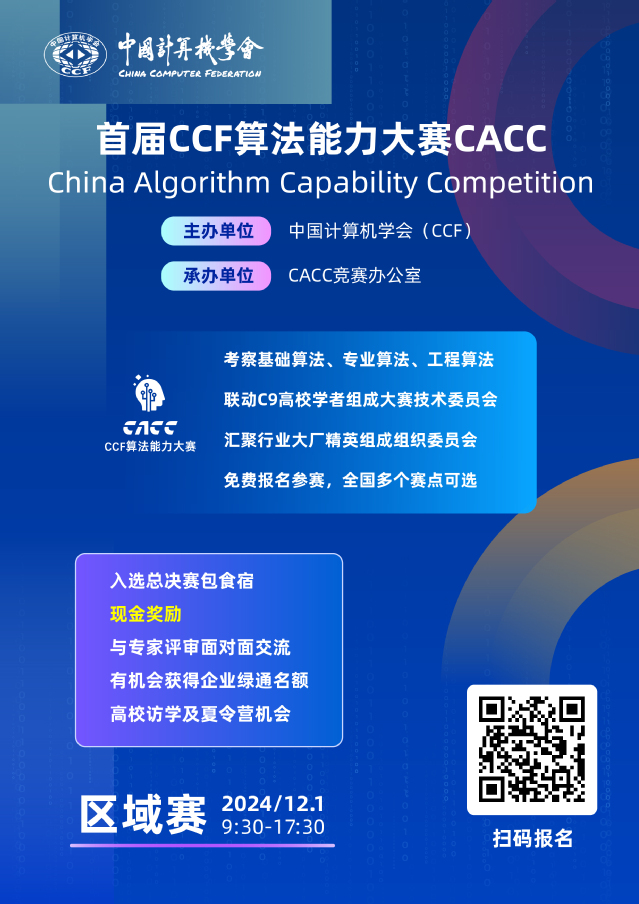 CCF算法能力大赛(China Algorithm Capability Competition,简称CACC),是一项面向在校大学生和从业工程师的算法竞赛,由中国计算机学会(CCF)创建,主要考察基础算法、专业算法、工程算法,旨在引导参赛选手提升编程、算法设计、建模及应用算法解决实际问题的能力。